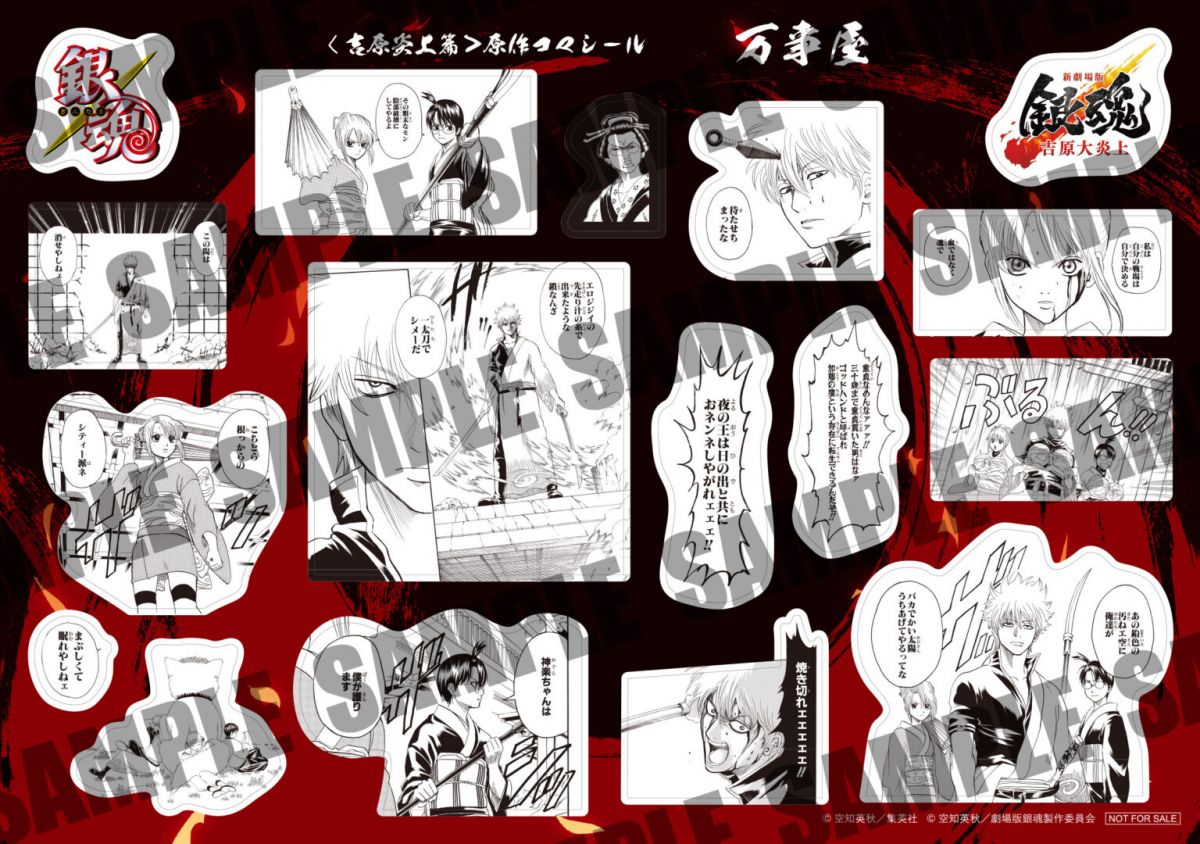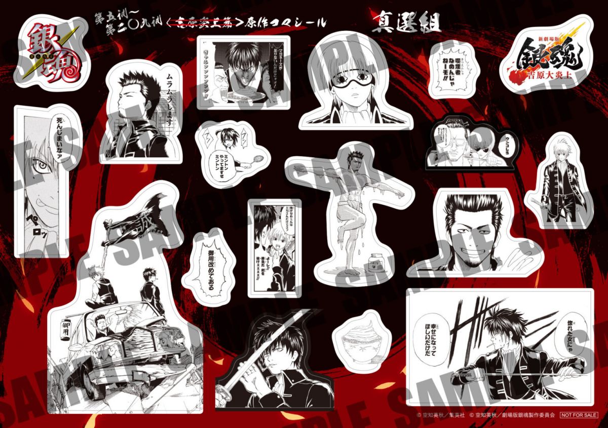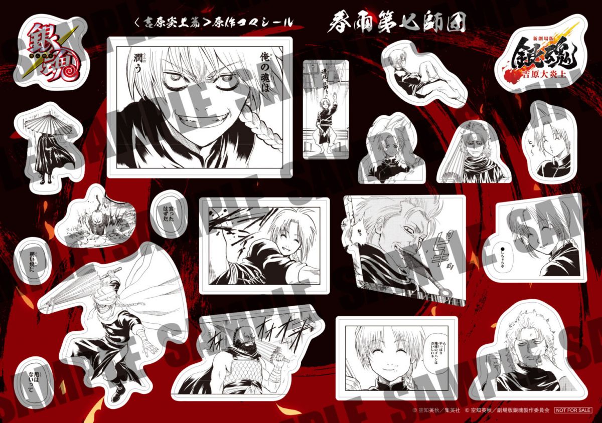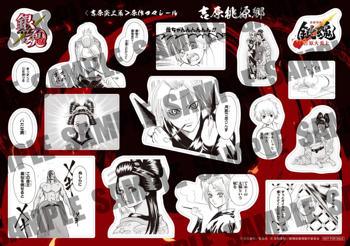 すべての上映劇場で万事屋・春雨第七師団・吉原桃源郷・真選組・攘夷党の全5種を数量限定ランダム配布!! シールには、晴太のために決死の覚悟で立ち上がる万事屋の面々をはじめ、吉原で対峙する神威や阿伏兎の熾烈な戦闘モード、そして、日輪や月詠の姿を凝縮。さらに、真選組や桂率いる攘夷党のシールには、お馴染みの名シーンや桂とエリザベスの勇姿が捉えられており、「吉原炎上篇」初め原作の名場面を集めたファン必携のシールとなっている。